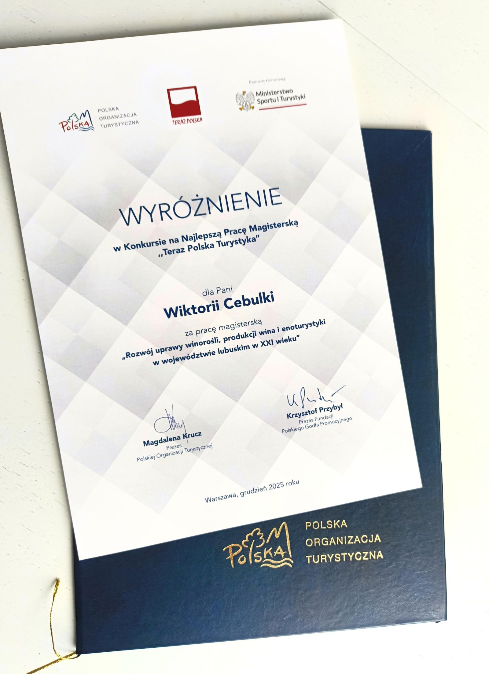 Mgr inż. Wiktoria Cebulka laureatką Konkursu na Najlepszą Pracę Magisterską "Teraz Polska Turystyka"