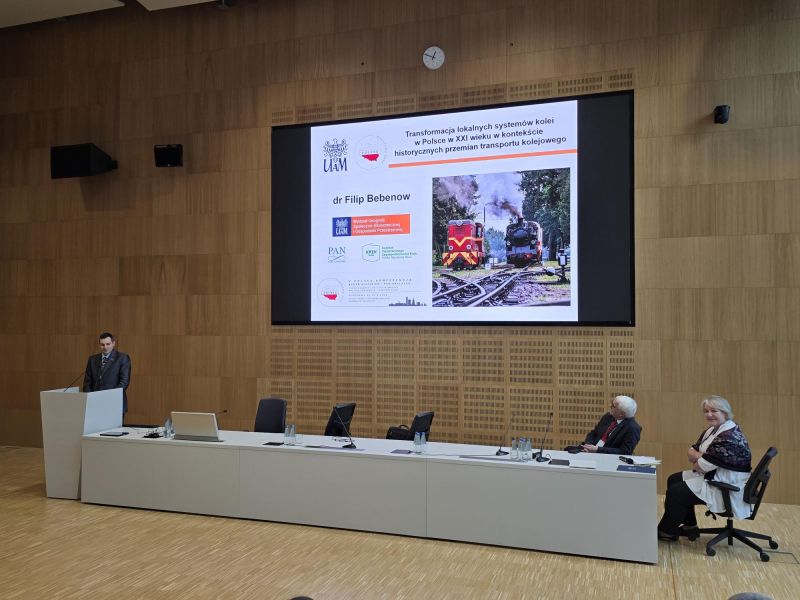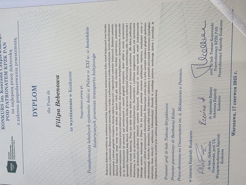 Wyróżnienie odebrał dr Filip Bebenow za pracę pt. „Transformacja lokalnych systemów kolei w Polsce w XXI w. w kontekście historycznych przemian transportu kolejowego”.
