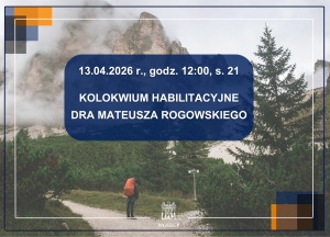 Szanowni Państwo,serdecznie zapraszamy na publiczne kolokwium habilitacyjne dra Mateusza Rogowskiego, które odbędzie się 13 kwietnia 2026 roku o godz. 12:30 w sali nr 21 Collegium Geographicum w Poznaniu. Kolokwium będzie miało charakter stacjonarny.Postępowanie dotyczy nadania stopnia doktora habilitowanego w dziedzinie nauk społecznych w dyscyplinie geografia społeczno-ekonomiczna i gospodarka przestrzenna. Podstawę ...